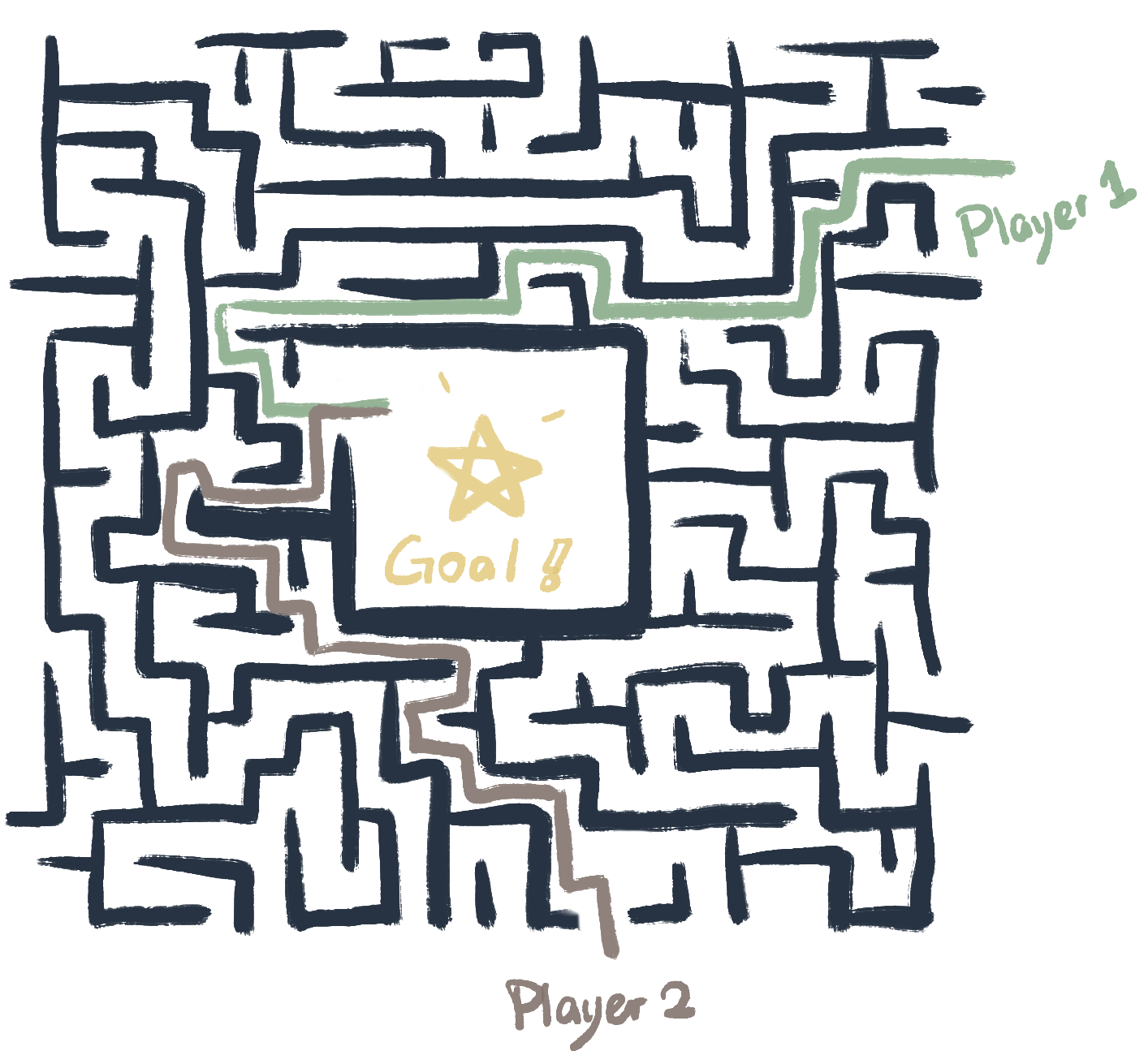 Auto generating maze and random player's positions and one final position to get, whoever meet the final goal first will be the WINNER~
